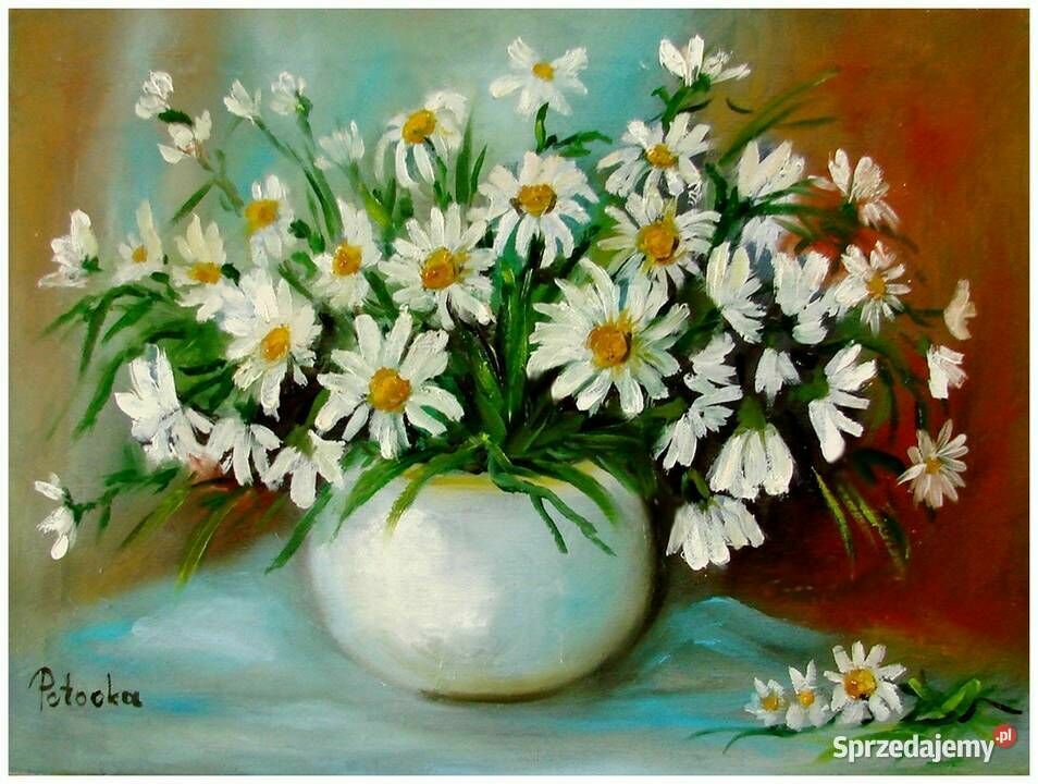 Na tym obrazie rozkwitają rumianki , królujące w eleganckiej białej wazie. Kwitną bielą płatków i żółcią środków, które przyciągają wzrok. Tło obrazu utrzymane w pastelowych odcieniach błękitu i brązu dodaje całości subtelnej głębi i ciepła. Jest jak cichy poranek pełen świeżości i spokoju, który niesie za sobą odrobinę nostalgii za beztroskimi chwilami. Artysta posługuje się techniką impastu, nanosząc farbę grubymi warstwami, co dodaje tekstury i ruchu. Widać tu swobodne pociągnięcia pędzla wyrażające dynamikę i lekkość. Obraz sygnowany, werniksowany.Sprawdź zainteresowanie tym ogłoszeniem