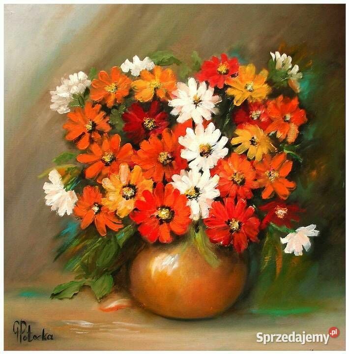 Na obrazie widzimy niezwykły bukiet kwiatów pełen energii i życia. Barwy są intensywne, a dominująca pomarańcz oraz czerwień kontrastują z bielą kwiatów. Kompozycja jest dynamiczna, pełna różnorodnych kształtów . Artystyczny styl jest swobodny, przypomina technikę impastu, gdzie grube pociągnięcia pędzla dodają tekstury i głębi. Obraz sygnowany, werniksowany.Sprawdź zainteresowanie tym ogłoszeniem
