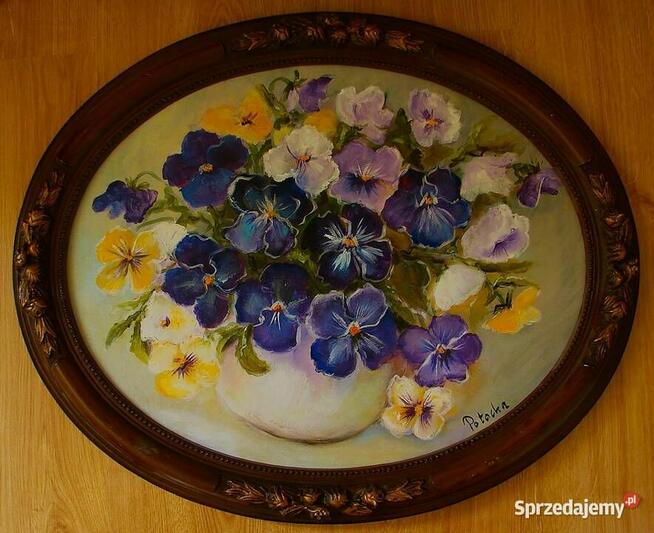 Obraz olejny dostępny ,, Bratki '' 30cm- 40 cm namalowany ekspresyjnie w bogatej, nasyconej kolorystyce . Malowany ...
