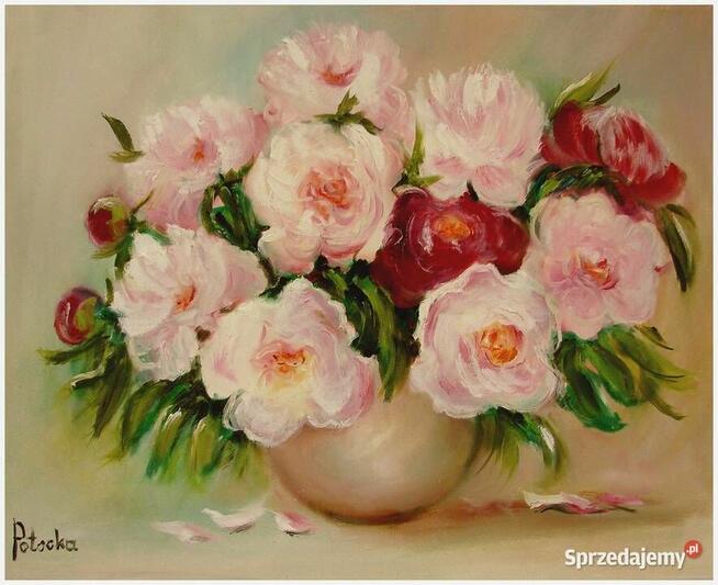 Na obrazie widzimy bukiet pełnych kwiatów piwonii w pastelowej gamie kolorystycznej. Delikatne róże, biele i odcienie ...