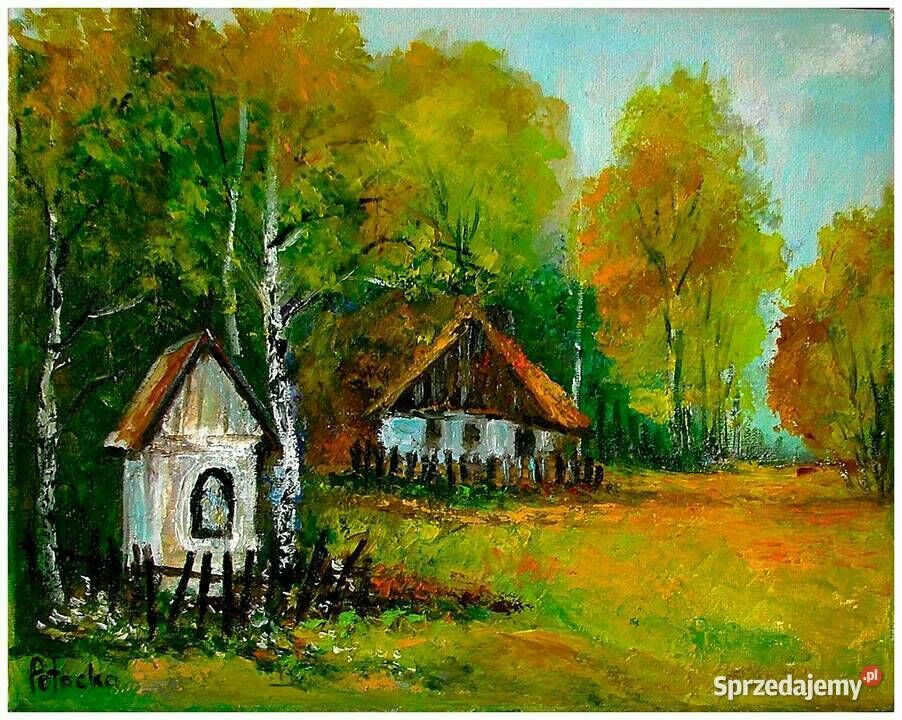 Obraz przedstawia spokojną, wiejską scenę zanurzoną w jesiennych barwach. Na pierwszym planie widzimy białą kapliczkę z czerwoną dachówką, otoczoną przez delikatnie wijący się drewniany płotek. Dookoła dominują złoto-zielone liście drzew, które zdają się szeptać historie dawnych dni. W tle dostrzec można stary, wiejski dom z dachem pokrytym strzechą, który wydaje się częścią krajobrazu, jakby stał tam od zawsze. Całość kompozycji skąpana jest w miękkim świetle, tworząc idylliczny i spokojny nastrój. Artyzm obrazu mieszka w prostocie - pociągnięcia pędzla są luźne, niemal impresjonistyczne, przywołując na myśl uczucie nostalgii za czasami, kiedy życie było bardziej slow. Drzewa otaczają dom i kapliczkę tworząc naturalną ramę dla tej spokojnej sceny. Dzieciak powiedziałby pewnie: Styl dzieła przypomina miłość do natury i prostoty życia. Obraz ten to jak pocztówka z przeszłości, w której każdy chciałby choć na chwilę zamieszkać. Obraz sygnowany, werniksowany.Sprawdź zainteresowanie tym ogłoszeniem