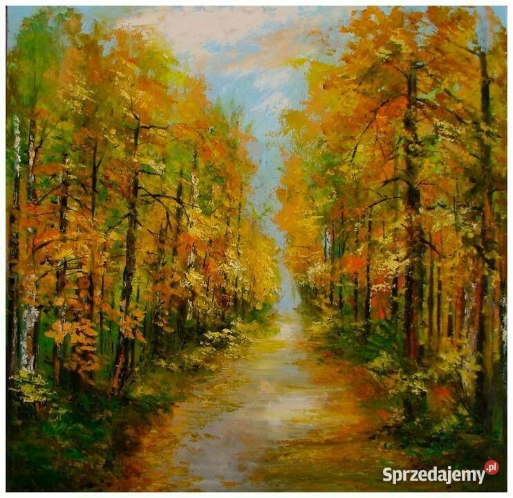Na obrazie widzimy przepiękną jesienną aleję, otoczoną smukłymi brzozami, które swą białą korą tworzą kontrast z żółto-złotymi liśćmi. Kompozycja zdaje się ciągnąć w nieskończoność, prowadząc wzrok w głąb tła. Całość jest namalowana mieszanką ciepłych i zimnych kolorów, które harmonijnie się przenikają, dodając dziełu głębi. Malarz zastosował technikę impastu, dzięki czemu liście zdają się wręcz wychodzić z płótna. To tak, jakby można było je dotknąć. Obraz emanuje spokojem i wyciszeniem, ale też nostalgią za mijającym czasem. Atmosfera jest bardzo magiczna, niemal baśniowa. Spacerując tą ścieżką, można poczuć zapach jesiennych liści i chłodnego powietrza. W wyobraźni widzę, jak wirują w powietrzu, tańcząc swój jesienny taniec. To właśnie prostota i piękno przyrody zachwycają najbardziej. To piękno, a jednocześnie ulotność momentu uchwycone w kadrze. Idealne na chwilę refleksji. Każdy może odkryć tu własną historię i zatracić się w niej na moment. Obraz sygnowany, werniksowany.Sprawdź zainteresowanie tym ogłoszeniem